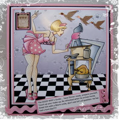 I had a lot of fun with this card and based it around the quotes/saying from The Good Wife Guide that was published in a Home Makers Magazine in 1955.If you get a chance you really should read it all, very, very funny......
